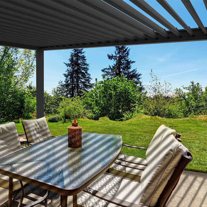 Met een lamellenoverkapping verander je je terras in een comfortabele leefruimte. Het dak bestaat uit kantelbare lamellen die je naar wens opent of sluit, zodat je zelf de hoeveelheid zon of schaduw bepaalt. Bij gesloten lamellen is de overkapping bestand tegen regen en wind, waardoor je ook bij minder mooi weer zorgeloos buiten kunt blijven. Zo geniet je in elk seizoen van een stijlvolle en functionele uitbreiding van je woning.